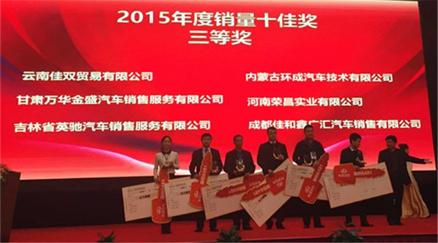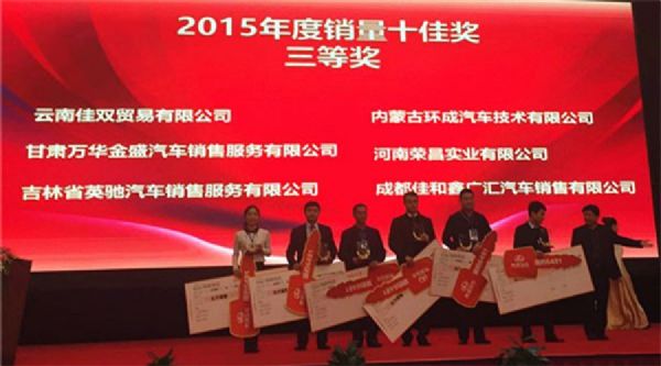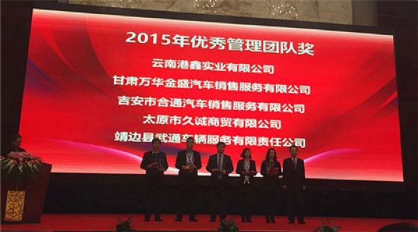 ,在湖南獵豹廠家完成2016年營銷工作規(guī)劃報告后,年會進入2015年度優(yōu)秀經(jīng)銷商頒獎環(huán)節(jié)。甘肅萬華金盛汽車銷售服務有限公司喜獲“2015年度銷量十佳獎 ”三等獎,贏得獵豹奇兵一輛、獎金5萬元獎勵;又憑借“2015年優(yōu)秀管理團隊獎”,獲得獎金3萬元。萬華金盛副總經(jīng)理盛斌代表獲獎單位上臺領獎。