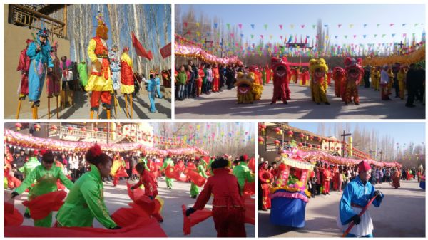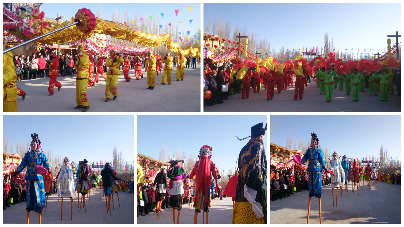 下午4時(shí)30分,敦煌市七里鎮(zhèn)莫高面業(yè)民間文化藝術(shù)社團(tuán)演員們穿著艷麗的服裝,踏著歡快的鼓點(diǎn),走進(jìn)千年敦煌·月牙泉小鎮(zhèn),所到之處,鑼鼓聲、彩車、秧歌、旱船競(jìng)相鬧春。在月牙泉小鎮(zhèn)中心街上,聞?dòng)嵡皝碛^賞的人們?cè)缫褜⒅行慕謬盟共煌ā?span lang="EN-US">