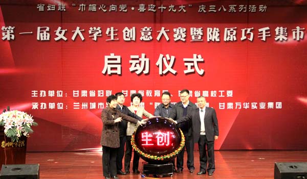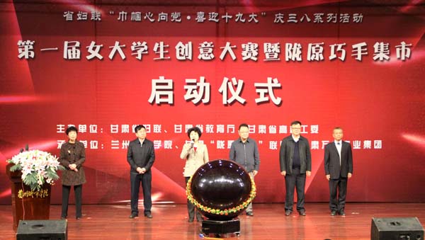 睿智創(chuàng)新始于心,激情創(chuàng)業(yè)踐于行。3月6日下午16時(shí)30分,由甘肅省婦聯(lián)、省教育廳、省高校工委主辦,蘭州城市學(xué)院、甘肅“隴原巧手”聯(lián)盟和甘肅萬(wàn)華實(shí)業(yè)集團(tuán)承辦的“首屆女大學(xué)生創(chuàng)意大賽暨隴原巧手集市”在蘭州城市學(xué)院正式啟動(dòng)。這是全省婦女慶祝三八婦女節(jié)107周年“巾幗心向黨·喜迎十九大”系列活動(dòng)的重要內(nèi)容,也是貫徹落實(shí)《甘肅省大力推進(jìn)大眾創(chuàng)業(yè)萬(wàn)眾創(chuàng)新實(shí)施方案》,提升“隴原巧手”社會(huì)影響力,鼓勵(lì)引領(lǐng)女大學(xué)生參與大眾創(chuàng)業(yè),萬(wàn)眾創(chuàng)新行動(dòng)的有力舉措。