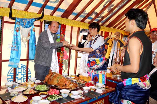 期間,調(diào)研組在月牙泉小鎮(zhèn)裕固族家園就餐,熱情好客的裕固族小伙為尊貴的客人獻上了潔白的哈達和濃香的酥油茶。嘉賓們品嘗了小鎮(zhèn)的各類特色美食,觀看了充滿民族特色的裕固族舞蹈,氣氛輕松活躍。
