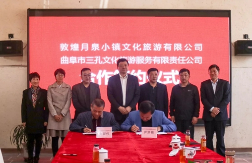 4月15日下午,山東省濟(jì)寧市旅游發(fā)展委員會(huì)黨組書(shū)記、主任楊鳳東帶領(lǐng)濟(jì)寧市旅游行業(yè)協(xié)會(huì)會(huì)長(zhǎng)、曲阜市三孔文化旅游服務(wù)有限責(zé)任公司董事長(zhǎng)尹洪福和濟(jì)寧市任城區(qū)、泗水縣、微山縣、梁山縣旅游局局長(zhǎng)來(lái)到千年敦煌·月牙泉小鎮(zhèn)考察,洽商兩地公司間的合作。甘肅萬(wàn)華實(shí)業(yè)集團(tuán)有限公司總經(jīng)理、敦煌月泉小鎮(zhèn)文化旅游有限公司董事長(zhǎng)牛新偉與山東曲阜市三孔文化旅游服務(wù)有限責(zé)任公司簽訂了兩地《旅游合作意向書(shū)》。