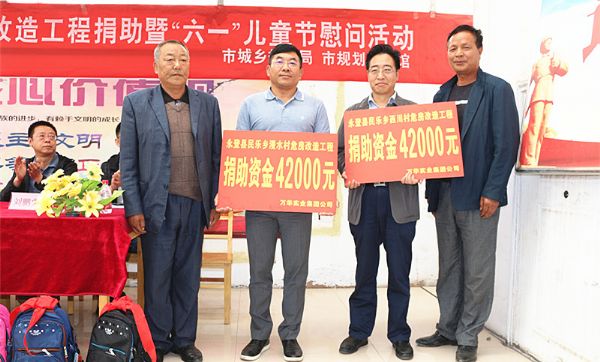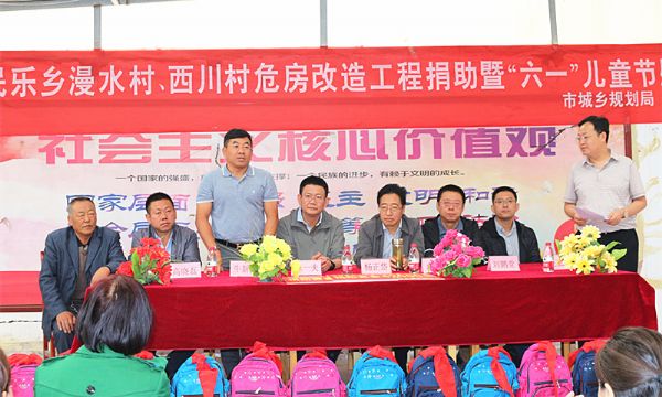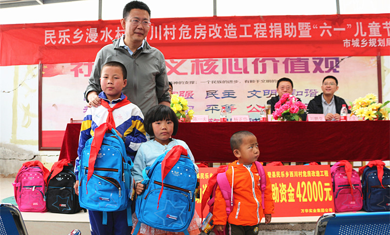 6月1日上午11時20分,民樂鄉(xiāng)漫水村、西川村危房改造工程捐助暨六一兒童節(jié)活動在永登縣民樂鄉(xiāng)漫水村村委會如期舉行。甘肅萬華實業(yè)集團有限公司向漫水村、西川村各捐助4.2萬元危房改造補助資金,蘭州市城鄉(xiāng)規(guī)劃局領導將嶄新的書包和學生用品送到當?shù)睾⒆觽兪种。蘭州市城鄉(xiāng)規(guī)劃局局長陳一夫、黨組書記楊正岱,蘭州市城鄉(xiāng)規(guī)劃局黨組成員、副局長盧健、楊正華、劉鵬堂,甘肅萬華實業(yè)集團有限公司董事長牛新民、副總經(jīng)理宿曉中,民樂鄉(xiāng)漫水村黨支部書記張成海,民樂鄉(xiāng)西川村黨支部書記楊天海等領導出席活動。
