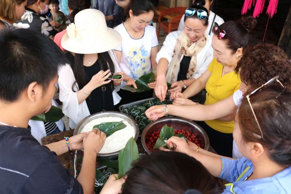 6月18日下午15時(shí),包粽子比賽在景區(qū)中心街開賽。游客爭相參與,捋粽葉、疊形狀、填米棗扎、包口。頓時(shí),三角形、牛角形、多邊形等別具式樣的粽子很快成型。