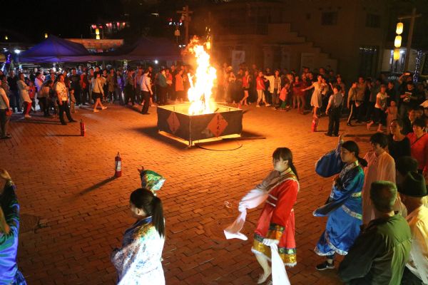 當(dāng)天晚上,月牙泉小鎮(zhèn)舉辦了篝火晚會(huì)。舞臺(tái)上輪番的精彩表演,讓游客們體驗(yàn)了民俗的真情。入夜時(shí)分,盡管天空下著毛毛細(xì)雨,但是絲毫不阻礙人們的歡快之情。篝火熊熊,火光沖天,歡樂的人們手挽著手,一邊伴隨著音樂韻律盡情舞動(dòng),一邊拍手擊節(jié)低唱淺吟,沉浸在無比歡樂之中。