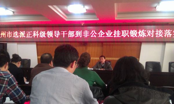 。ňC管中心 鄒秀芳)2013年3月6日下午15時,蘭州市選派正科級領導干部到非公企業(yè)掛職鍛煉對接落實會議于蘭州市工商局召開。蘭州市工商局黨組成員、紀檢組長李繼軍主持會議,蘭州市非公辦主任王延紅出席會議。