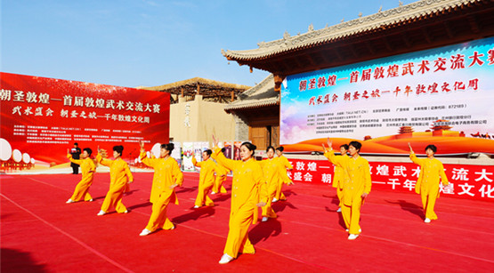 10月10日,朝圣敦煌——首屆敦煌武術(shù)交流大賽開幕式在千年敦煌·月牙泉小鎮(zhèn)民俗文化旅游景區(qū)盛大開幕。武術(shù)大賽在敦煌市委、市政府的大力支持下由甘肅省太極拳協(xié)會(huì)、太極網(wǎng)、未來傳媒、廣至傳媒、北京甘肅商會(huì)主辦,四方拍賣、敦煌千年古城文化發(fā)展有限公司承辦,千年敦煌·月牙泉小鎮(zhèn)民俗文化旅游景區(qū)、敦煌市武術(shù)協(xié)會(huì)、敦煌市太極拳協(xié)會(huì)、臨夏州太極拳協(xié)會(huì)、蘭州銀行敦煌分行、中國(guó)民營(yíng)文化產(chǎn)業(yè)商會(huì)、中國(guó)收藏家協(xié)會(huì)、甘肅收藏家協(xié)會(huì)、蘭州市名匯秦川商貿(mào)有限公司、北京微海聯(lián)合電子商務(wù)有限公司、甘肅省臨洮縣豐盈綠洲種植專業(yè)合作社協(xié)辦。全國(guó)武術(shù)愛好者在充滿魅力的人文敦煌首次同臺(tái)競(jìng)技。