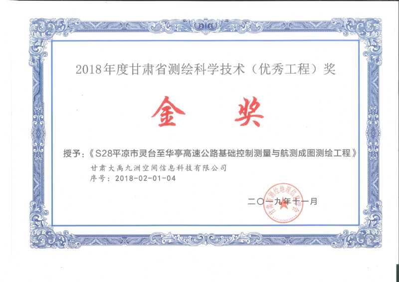 2018年度甘肅省測繪科學(xué)技術(shù)(優(yōu)秀工程)獎金獎
